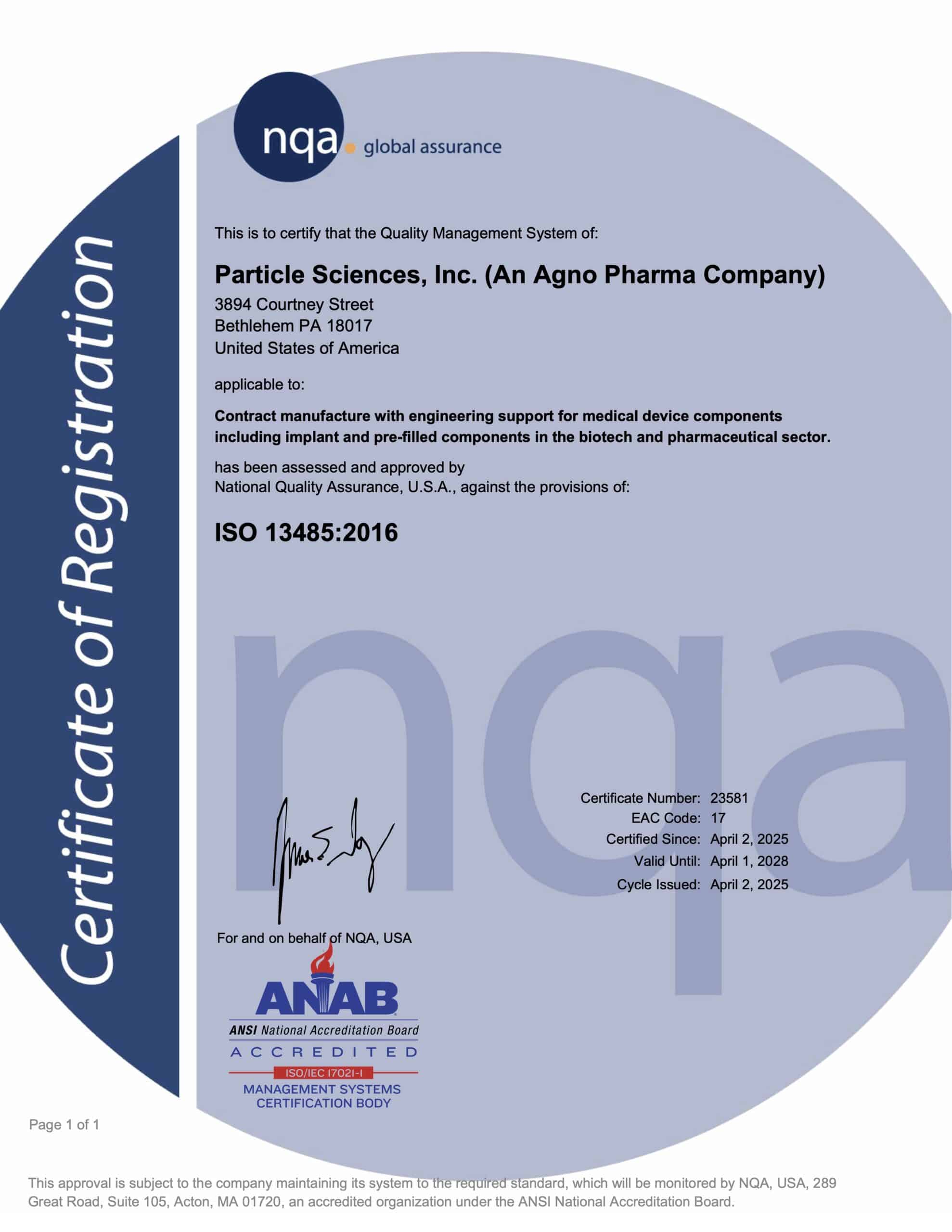 Agno Pharma’s Particle Sciences facility in Bethlehem, Pennsylvania has been certified to ISO 13485:2016 by NQA on April 2, 2025, signaling device‑grade quality discipline for implants, prefilled components, and drug–device interface manufacturing. The certification elevates audit readiness, accelerates tech transfer, and de‑risks late‑stage scale‑up for programs moving toward registration.